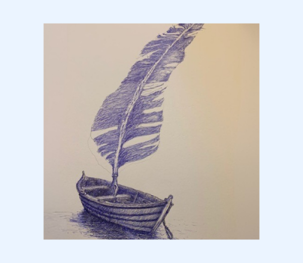 Een ‘houten' recreatief/vissersbootje met als ‘zeil' een vederpen of ganzenveer. De pen schrijft niet met inkt maar met het water van de Dender zelf. Als het ware, schrijft de rivier en zijn omgeving telkens een nieuw eigen verhaal op dat geïnspireerd is op zijn telkens veranderende oevers, voorbijschuivende landschappen en -bewoners, veranderende behoeften en inzichten in industrie, ecologie, recreatie, cultuur,...