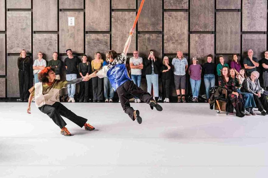 Geleid door het stuwende geluid van een drummer nemen twee circusperformers je mee in hun wereld op het podium. Ze hebben mekaars hand vast, en zullen ook dat van jou nodig hebben. Want de indrukwekkende trucs kunnen enkel en alleen uitgevoerd worden als jij ze de hand toereikt.