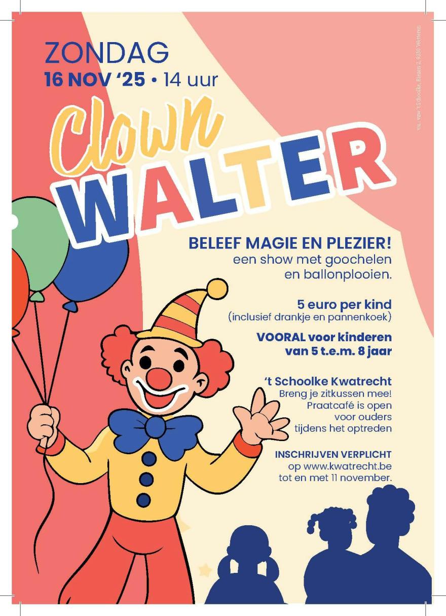 Dit jaar Clown Walter in 't Schoolke Kwatrecht. Beleef magie en plezier! Een show met goochelen en ballonplooien.