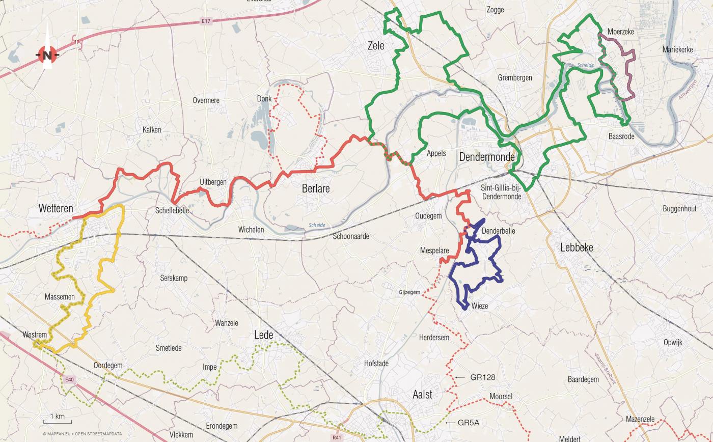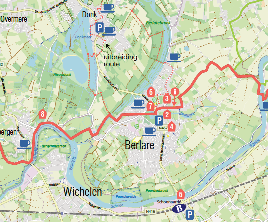 Je volgt de rood/witte GR-aanduiding en de groene pijlen (door Berlare). De rode route is ook onderdeel van het Europees traject dat de regio doorkruist. Die komt het land binnen in Ieper om zo richting Nederland te trekken via Beveren. Hier vind je de gpx route voor het Vlaamse gedeelte van de Sint-Martinusroute. - Groene route: Op stap met Sint-Maarten in Hamme, Zele en Dendermonde (52 km): digitale kaart - gpx route